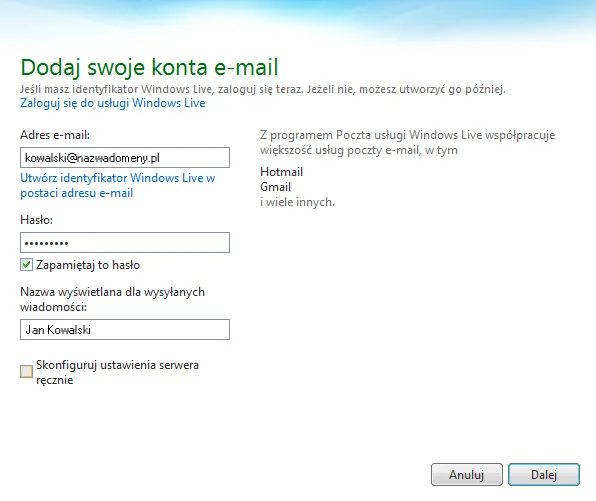 Przyjmujemy, że chcemy skonfigurować konto e-mail o nazwie kowalski@nazwadomeny.pl należące do użytkownika Jan kowalski.